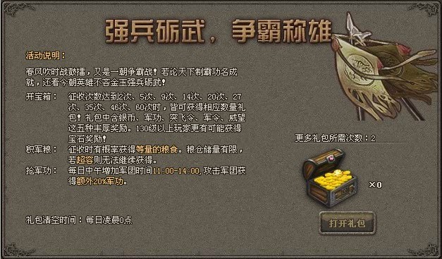 开宝箱:征收次数达到2次、5次、9次、14次、20次、27次、35次、46次、60次时,可得到相应数量的礼包!