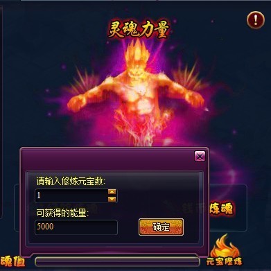 5、 VIP3以上等级玩家的境界技能-【灵魂力量】,新增元宝炼魂功能,花费1元宝可获得5000点炼魂值。