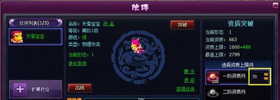 3. 伙伴突破界面,增加资质丹的批量吞噬按钮。