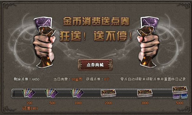1、每消费金币达到一定数目,就可以领取大量点券
