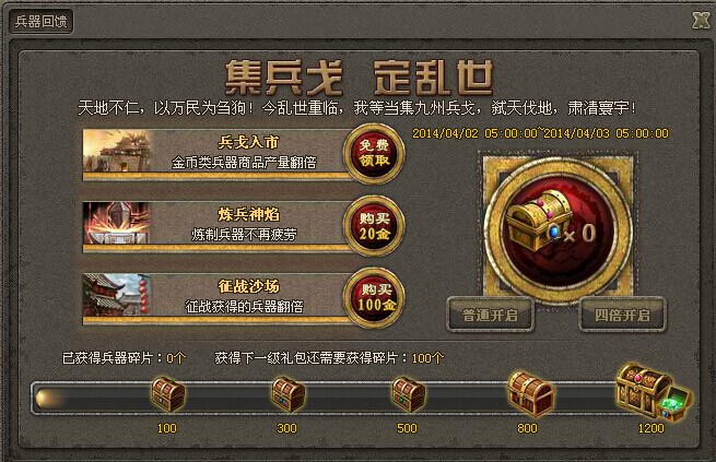 b)     兵器产量达到一定数量,可领取对应宝箱,宝箱可选择普通开启或四倍开启