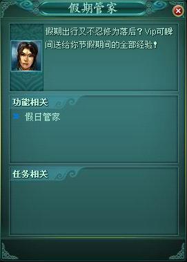 3、假期管家为VIP功能,角色在VIP有效期内且角色等级在40以上的时可以使用。
