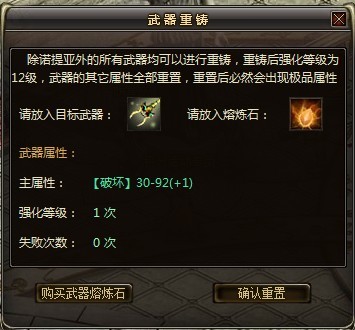 武器熔炼石:可以将任意武器重铸为12次强化全成功状态,并随机出现极品属性(原有的极品属性将有可能消失)