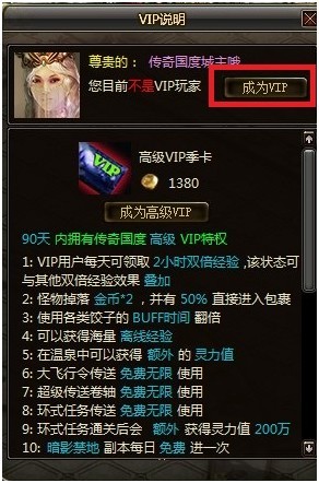 新增道具:高级VIP季卡 商城售价:1380元宝 道具说明: