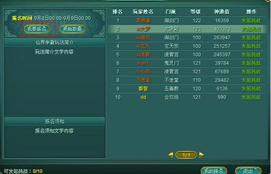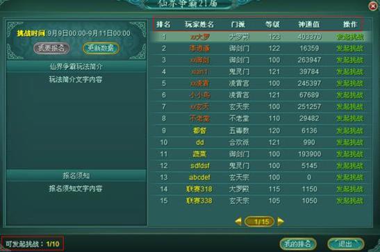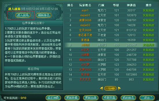 在报名时间结束以后,进入到挑战阶段,在这个阶段,玩家可以挑战自己前面的人以获取仙王的争取权。