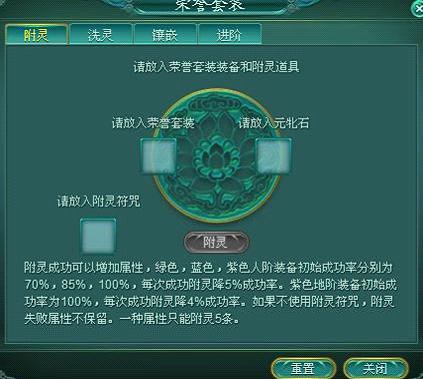 荣誉套装本来是没有属性的,需要通过附灵来生成属性。附灵需要元牝石。