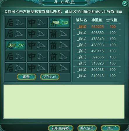 军团生成:在服务器中选取前排名前81名的战队,按照平均神通值分成9个档次,1-9、10-18…….72-81,然后再每一个档次中各选取一个战队共组成9个军团,分别分配给9大金将。