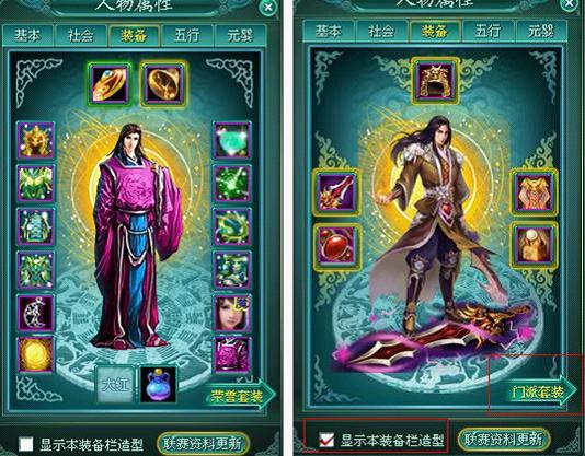 装备位置:打开装备界面以后,玩家可以在右下角切换玩家的门派套装或者是荣誉套装。并可以选择显示哪套装备的样子。