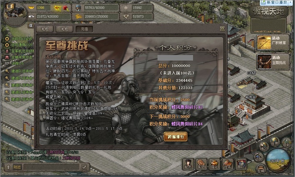 通过挑战,玩家可积累积分,当达到一定积分后可获得玉石、紫披碎片等贵重奖励。积分越高,奖励越丰厚。