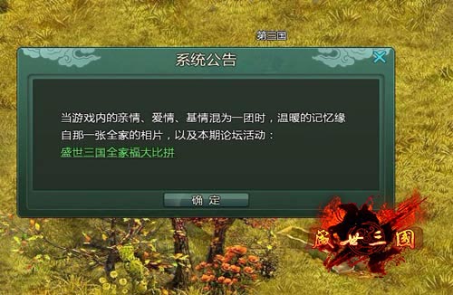 陪游《盛世三国》里面,系统经常会出现一些公告。这些公告玩家可要多注意哦!每次我们会以系统公告的方式告诉玩家们游戏又出现了哪些新的活动等等。玩家们可以通过系统公告里面的消息参与陪游《盛世三国》的活动。这些活动不仅可以让你们增长经验值快速升级,还可以让你们展示家族的力量,展示你们在游戏里面的亲情、友情和爱情。