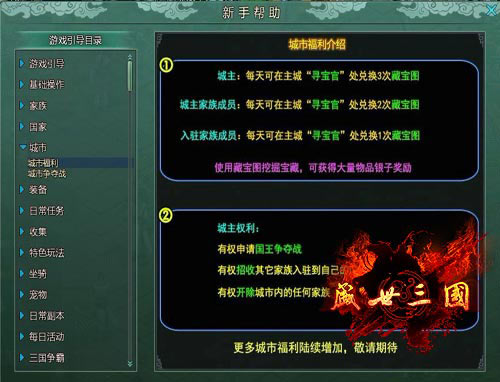 凡是参加陪游《盛世三国》城市争夺战的玩家们都可以领到城市的福利哦!不过不同的级别领取的城市福利是不一样的!城主,每天可以在主城“寻宝官”处兑换3次藏宝图。城主家族成员则每天可以在主城“寻宝官”处兑换2次藏宝图。对于那些入驻家族的成员每天可以在主城“寻宝官”处兑换1次藏宝图。
