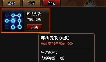 今后阵法将不会有提升属性的效果,玩家如果想要先攻值则只能通过升级先攻阵来提升。玩家升级一次阵法先攻提升先攻值4000,以后每次升级提升值相同。玩家第一次升级阵法先攻需要消耗4000阅历,以后每次升级多增加1000阅历的消耗,既第二次升级需要5000阅历,第三次升级需要6000阅历。